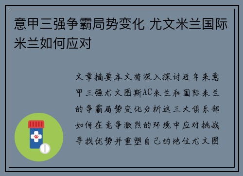 文章摘要:本文将深入探讨近年来意甲三强——尤文图斯、AC米兰和国际米兰的争霸局势变化,分析这三大俱乐部如何在竞争激烈的环境中应对挑战,寻找优势并重塑自己的地位。尤文图斯在经历了财政危机和阵容老化的挑战后,如何通过引援和青训恢复竞争力;AC米兰凭借强大的财力和新一代球员的崛起逐渐回归顶尖行列;而国际米兰则通过稳定的管理和战术体系逐步取得进步,争取重夺意甲霸主地位。本文将从四个方面详细解析三强在这一过程中采取的应对策略,揭示他们在未来争霸局势中的潜力与挑战。