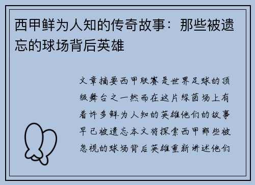 因此,我们在回顾西甲历史时,不能只关注那些锋芒毕露的球员和顶级俱乐部,更应注重挖掘背后那些被遗忘的故事和人物,正是他们的默默贡献和坚韧精神,使得西甲联赛始终充满活力和魅力。